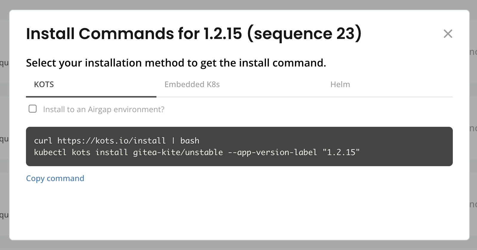 For information about getting installation commands with the Replicated CLI, see channel inspect. For information about getting installation commands with the Vendor API v3, see Get install commands for a specific channel release in the Vendor API v3 documentation.